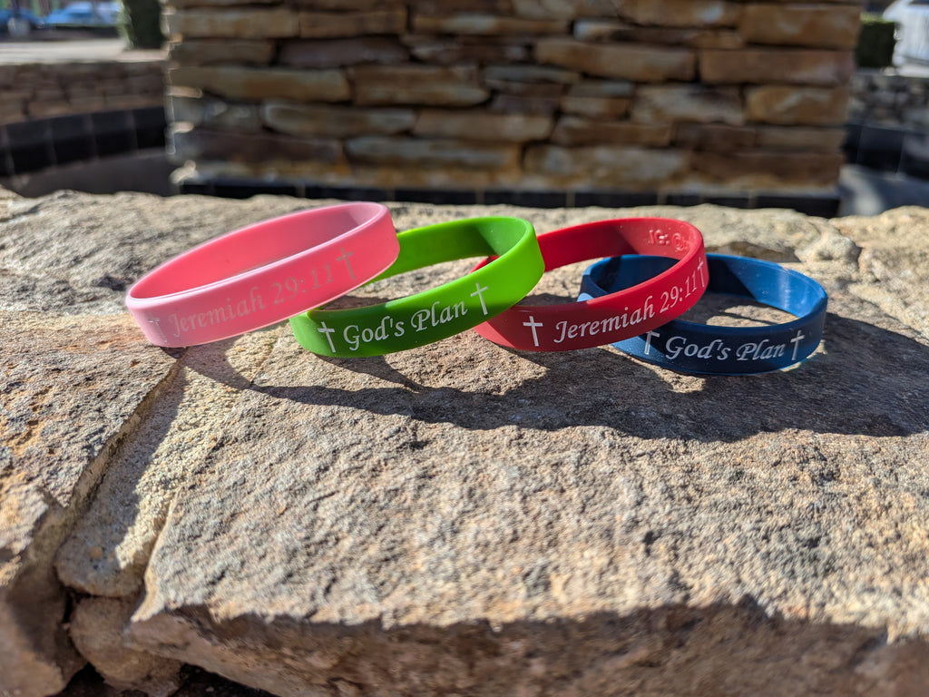 Silicon wrist bands with "God's Plan"embossed on one side and "Jeremiah 29:11" embossed on the other side. Four pack includes (1) green, (1) burgundy, (1) navy, and (1) pink wrist band.